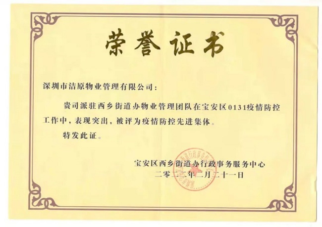自宝安区石岩街道0131疫情爆发后,洁原物业派驻西乡街道办物业管理团队接到街道归队指令,要求返乡人员立即返程,2月1日全员回到岗位,当晚即投入疫情防控援助工作中,期间为500多人的后勤物资配送无一差错,在此期间,该管理团队所有人员身先士卒,不怕吃苦,不畏艰难,得到街道领导高度认可,被宝安区西乡街道行政事务服务中心评为疫情防控先进集体。