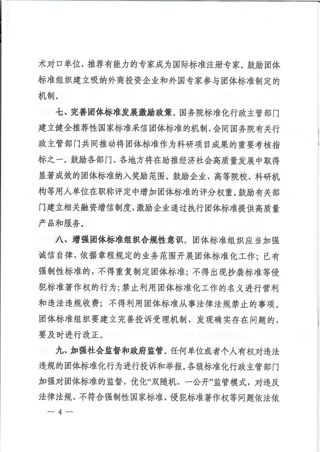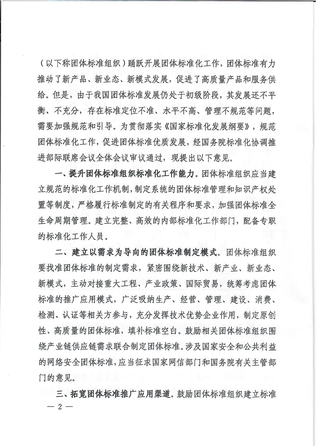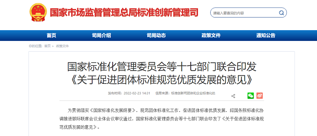 为贯彻落实《国家标准化发展纲要》,规范团体标准化工作,促进团体标准优质发展,经国务院标准化协调推进部际联席会议全体会议审议通过,近日,国家标准化管理委员会等十七部门联合印发了《关于促进团体标准规范优质发展的意见》。