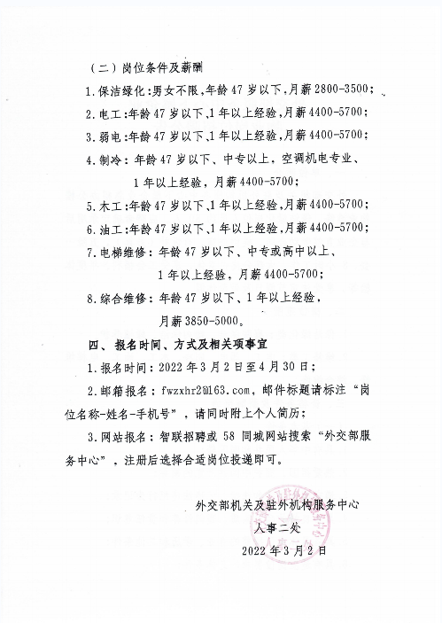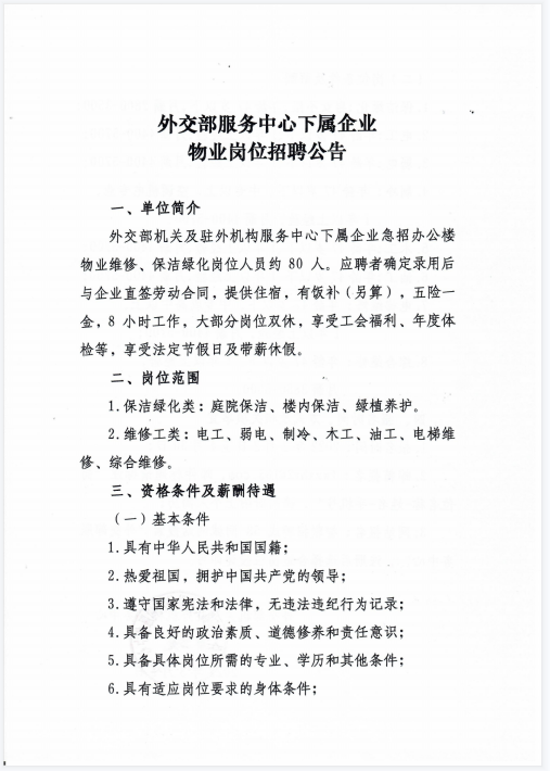 外交部服务中心下属企业物业岗位招聘公告