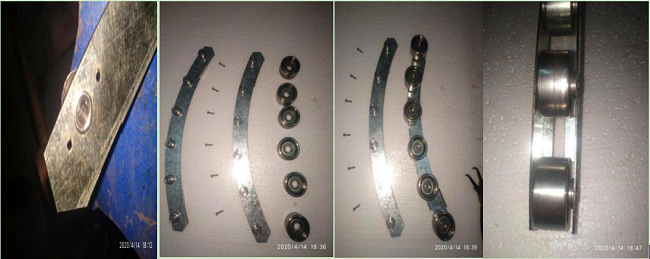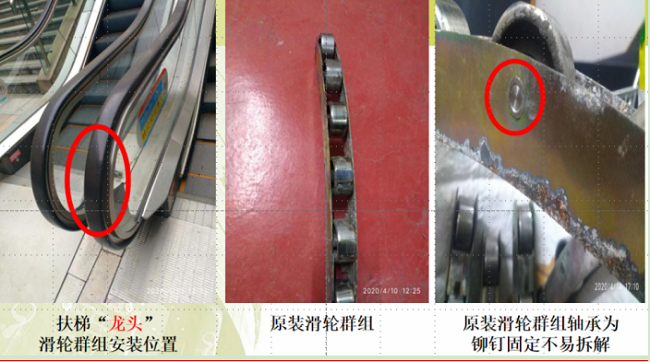 解决问题:扶梯滑轮群组损坏换新率较高,扶梯整套滑轮为6个轴承一组,原设计为铆钉固定,当1个轴承损坏而另外5个轴承和支架在完好的情况下,进行维修耗费工时过多,工时费甚至超过换新费用,所以往往只能选择整体更换。