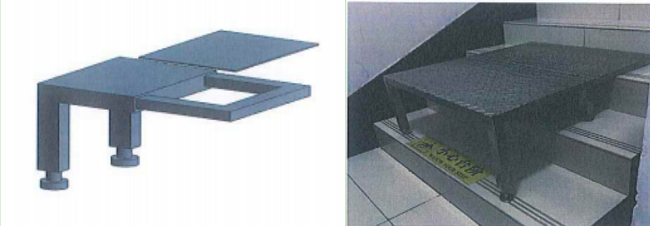 案例描述:目前大多数楼宇均设有电梯,但是消防通道楼梯也是楼宇必不可少的一部分,在楼宇日常维护中,楼梯间的照明灯具需时常维修,墙面脱落也时有发生。然而由于楼梯间构造的特殊性,经常有些维修面处于维修工无法站立触及的高度,又由于楼梯台阶的高低错落与狭窄,导致无法直接架设人字梯。因此自行打造了一款“楼宇楼梯间用人字梯放置平台”,设计根据楼宇楼梯间内台阶高度与宽度而定,使楼梯间内三格台阶形成同一水平放置面,来达到辅助人字梯等登高作业工具平稳安全架设的目的。楼宇楼梯间用人字梯放置平台需根据楼宇台阶高度与宽度打造,属于定制化工具平台。