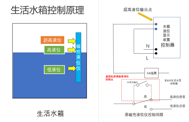 增加超高液位停泵功能。生活水箱的超高液位利用原水箱液位显示装置的超高液位输出点位,加装二次防护,当水箱液位超高时,强制停止生活水泵供水。磁性液位仪高液位控制点、水箱液位显示装置的压力传感器超高液位控制点,两套系统平行控制,互不干扰,当磁性液位仪的浮球高液位控制发生故障时,压力传感器的超高液位控制点起作用,及时停止生活水泵运行。