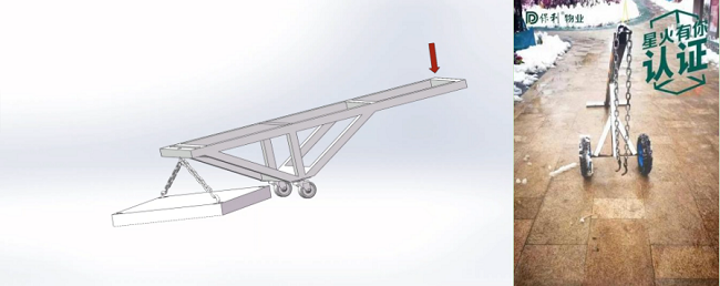 案例描述:园区及市政路面根据使用需求(如雨水、污水、线缆设置地下铺设等)设置检修、维护孔洞,但铸铁材质的铺装井盖面积大、质量重。为了提高物业人员出户井检修效率,根据市场需求设计研发一种“井盖移动式开启装置”,该装置方便制作、安装使用并彻底解决井盖开启作业耗时、耗力等难题。利用杠杆原理,采用废弃方管焊接出一种车型井盖移动式开启装置,最终实现单人即可抬起井盖,且安全系数提高。在设计的过程中采用SLDWORKS进行三维数字建模,在电脑中对设计的锁紧装置进行运动干涉、碰撞、应力计算、模拟安装等,大大缩短了研发周期和成果质量。依据风险矩阵判定改善前的风险等级为高,同时根据LOPA(保护层分析法),判定改善之后的风险等级为低。由于采用废弃方管,改装置价格低廉,制作安装简单,且适用80%以上室外井,采用机械作业保障员工安全性;装置可量产,覆盖面积广。