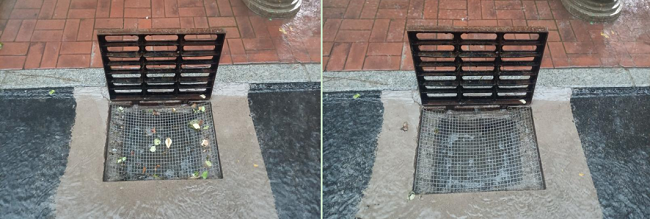 案例描述:小区雨水篦子因原设计缺陷,孔隙间隙大,在大雨时落叶、白色垃圾等异物冲进雨水排水渠内造成堵塞,雨水渠的清掏产生了额外的保洁工作量。通过自制过滤网,对雨水蓖进行二次过滤,对落叶、石子、白色垃圾等杂物有显著的过滤效果。