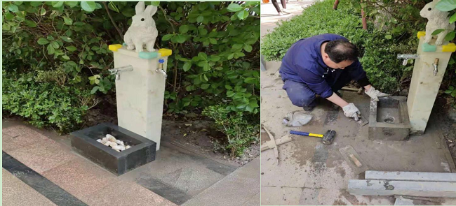 案例描述:因园区内经常有老人带领儿童玩耍、下棋、聊天等,结合疫情管控,洗手节水装置方便儿童及老年人玩耍后及时清洁。为节约用水,正面采用按压式水龙,按压后出水3秒内自动停止放水;侧面为保洁取水点采用钥匙水龙头,使用时有钥匙可开关截门,防止儿童浪费水源,钥匙由保洁专人管理钥匙;废水将排入绿化内浇灌草坪树木。既方便业主使用,又减少了绿化工作量,提升了业主满意度。此装置用途广泛,可应用于室外休闲区、儿童娱乐场地、人员密集场地、园区人流量较大主要出入口等位置。