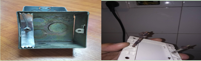 案例描述:照明设备及墙壁插座由于环境潮湿等原因会造成暗装金属盒锈蚀,螺纹损坏,从而导致墙壁固定螺栓孔损坏,造成开关不能有效固定,开关松动倾斜。如果更换新安装盒,则需要墙面破拆,更换费用高。解决办法:第一步:选取具有弹性的金属薄片;第二步:利用电钻、制模器、砂轮、尖嘴钳等工具将薄片制造成合适的大小,在薄片中间位置穿孔;第三步:用锤子和弧型砂轮将薄片压弯到能够放入暗盒内。