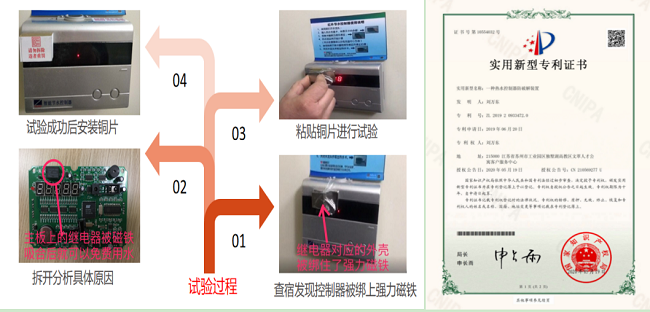 案例描述:目前,刷卡式热水控制器在酒店式公寓、学生公寓等场所广泛应用,这种热水收费依靠热水控制器上进行刷卡收费。但该控制器存在设计缺陷,用强力磁铁吸附在控制器外壳,通过强磁吸合控制器内开关触点,接通启动开关,不用刷卡付费就能免费使用热水。针对此缺陷,成功研发“控制器防破解装置”,在热水控制器外壳对应的继电器位置,安装一块尺寸2.5厘米*3.5厘米,厚度达10毫米的铜片(低于10毫米无法完全屏蔽磁力),利用铜片来屏蔽磁力。目前业主方根据所建议的解决办法,定制2072块铜片,由物业负责安装。安装后运行效果良好,不仅杜绝了水资源的浪费,扼制了不良风气,同时挽回了业主方的经济损失。