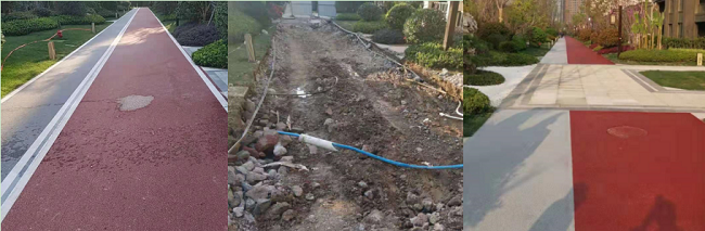 案例描述:可用于替换自行车道、园区路面等混凝土路面或沥青路面解决问题。通过与开发商对接,将内部主干道沥青路面设计更改为透气混凝土设计,增加路面渗水能力。该方案适用于老旧破损路面改造,提高小区抗涝能力。改造道路无积水,提高城市生态系统,提高园区观感。对比混凝土道路,每平米节省成本400元左右,且施工周期减短。