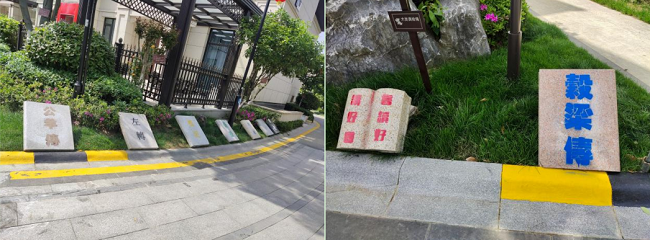 解决问题:通过在石头上喷书名的方式,将文化汇入小区街景中,提高业主读书学习意识,提升社区品质和艺术感。