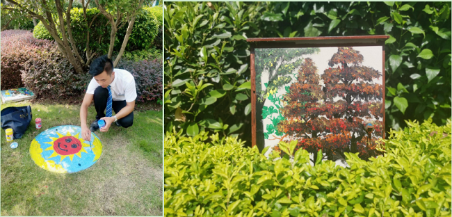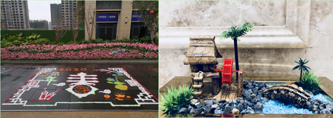 在第一阶段美化工作完成后,得到了项目方的认可,项目方主动给予经费支持,让服务中心员工更好的去做环境美化。在有经费的支持后,员工购买了更多画具材料,利用轮休时间将园区的井盖、电箱绘制成一幅幅生动画作,与园区景色融为一体。水系布置在原有单一色调的基础上增加了多色沙石,在特别的节假日进行相应的布置,得到了客户的赞美。并在钛金烟灰缸利用购买的小饰品布置成有剧情的小场景,在石头上进行彩绘及写字,在暖心提示的情况下,也增加了园区公共空间的趣味性。
