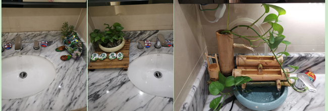 首先利用园区内自有的白色细沙石对水系观景进行了布置,在水系内由细沙石绘画并摆弄成一些温馨用语。用园区里面的竹子及品相较好的石头,制作成工艺品摆放至卫生间,美化环境。
