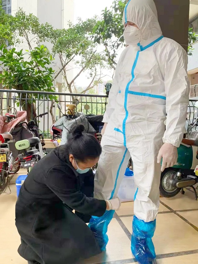 当城市被按下暂停键,龙光服务物业人却奔跑在危险边缘,为业主们筑起一道道安全防线。从过年到现在,深圳君悦龙庭项目经理詹瑜静持续坚守岗位40多天,园区巡查、入户排查、核酸检测……在落实各项防疫工作的同时,身先士卒,带领调动同事积极投身一线。接到深圳“封城”通知,詹瑜静说:“疫不容辞,我们已做好战斗准备!”图为詹瑜静帮员工检查防护装备。▲