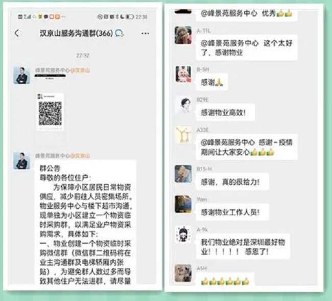 为了保障小区居民日常物资供应,3月13日晚上,汉京物业所服务的汉京峰景苑为小区建立物资临时采购群,方便业户采购物资,获得业户们的认可与点赞。▲