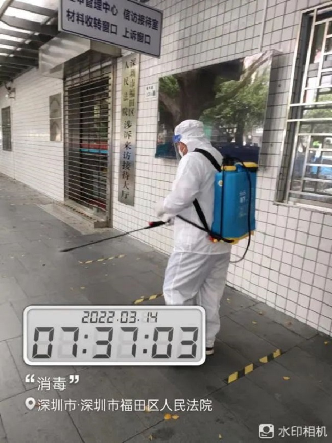 为了做好福田区人民法院疫情防控工作、保障法院内环境安全,福田物业法院物业服务中心消毒人员每日穿着密不透风的防护服、全副武装,背着重重的喷壶行走在法院的每一处,一遍又一遍!▲