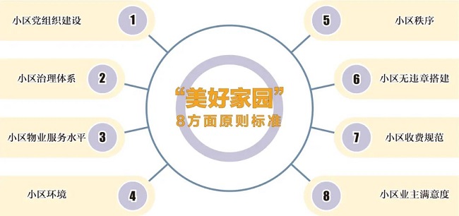 2021年初,中央文明委将“加强物业管理共建美好家园”列入中央文明委2021年重点工作台账。2021年3月,住房和城乡建设部精神文明建设办公室印发了《住房和城乡建设系统开展加强物业管理共建美好家园活动的实施方案》,方案提出该项活动的主要工作内容、时间安排和工作要求,明确了“美好家园”小区党组织建设、小区治理体系、小区物业服务水平、小区环境、小区秩序、小区无违章搭建、小区收费规范、小区业主满意度等8方面的原则标准。