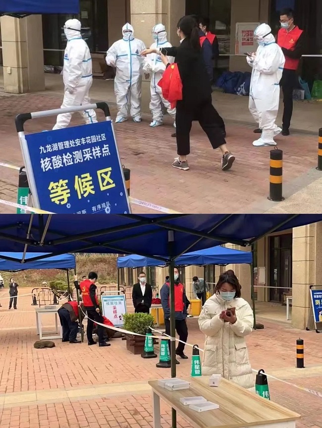 面对突如其来的疫情,赣电聚兴物业实时关注疫情动向,各项目的工作人员日夜坚守。在小区封控之时24小时坚守在疫情第一线,与社区办事处、居委会紧密联动,全力配合医护人员,开展核酸检测配合工作,组织业主及公司员工有序排队,按流程登记检测。