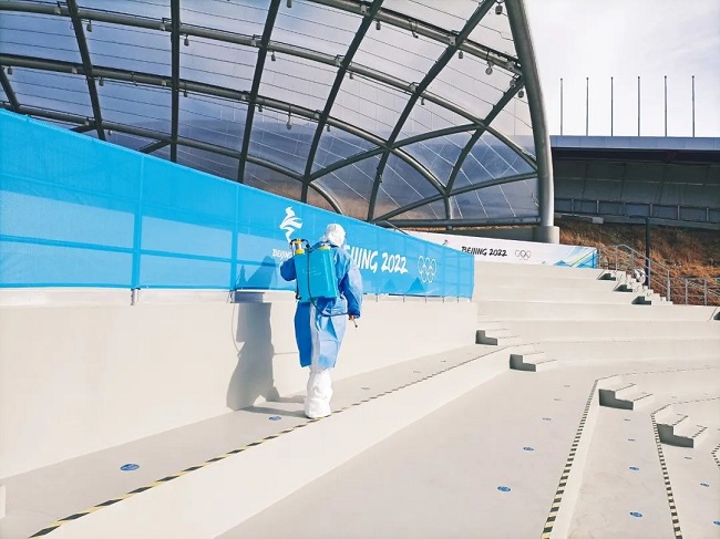 北控物业在此次冬奥会期间,主要承担北京延庆赛区国家高山滑雪中心、国家雪车雪橇中心两个比赛场馆和西大庄科村一个保障点位的物业服务工作。图为北控物业服务人员在冬奥会外部场馆进行专业消毒。