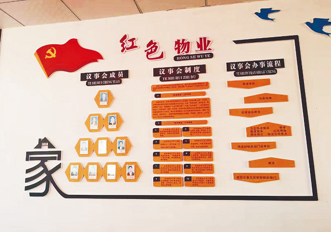 二是推动党建引领红色物业工作。纳金街道办和物业服务企业共建“红色阵地”,纳金街道办党工委对物业服务企业党支部进行党建引领和指导,不断规范物业管理制度,及时为居民提供社区动态、物业服务、惠民政策等服务。小区每栋楼都设置了专职“红管家”,负责了解协调单元居民的问题。同时,社区和物业服务企业成立联合党支部,通过“红色议事厅”积极解决居民的难事,使物业服务企业融入基层社会治理,使基层党建有色彩、有温暖、有活力,让社区群众有更多的幸福感和获得感。