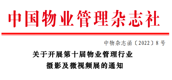 为落实《住房和城乡建设部等部门关于加强和改进住宅物业管理工作的通知》(建房规〔2020〕10号)“组织开展最美物业人宣传选树活动,增强从业人员荣誉感和归属感”的文件要求,展现物业人风采,弘扬物业管理行业精神,向党的二十大献礼,《中国物业管理》杂志社联合各地物业管理行业协会,共同开展以“最美物业人”为主题的第十届物业管理行业摄影及微视频展,现就有关事项通知如下: