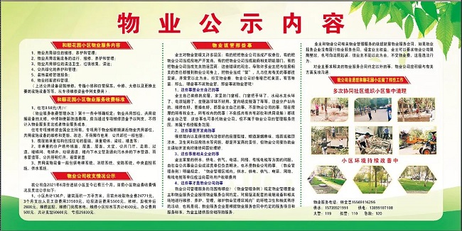 三是加大物业服务收费信息公开力度,让群众明明白白消费。小区及时更新“三公开三公示”公示栏,在住宅小区醒目位置将服务内容、服务标准、收费标准、收费依据、岗位设置、报修电话、投诉电话等信息进行公示,主动接受业主及相关部门的监督。细化各物业服务项目的服务标准,实现服务质量与合同约定标准相统一,增加物业服务收费透明度,畅通群众投诉渠道。