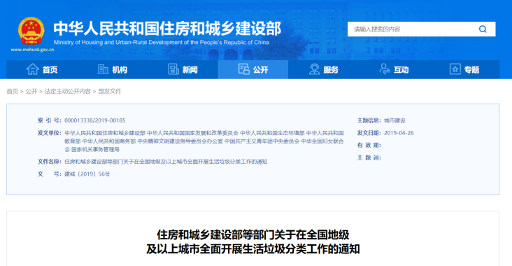 住房和城乡建设部等部门关于在全国地级及以上城市全面开展生活垃圾分类工作的通知