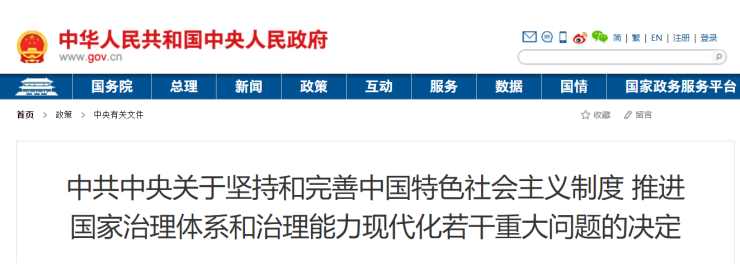 为贯彻落实党的十九大精神,十九届中央委员会第四次全体会议着重研究了坚持和完善中国特色社会主义制度、推进国家治理体系和治理能力现代化的若干重大问题,作出如下决定。