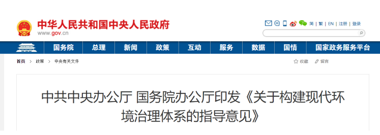 近日,中共中央办公厅、国务院办公厅印发了《关于构建现代环境治理体系的指导意见》,并发出通知,要求各地区各部门结合实际认真贯彻落实。