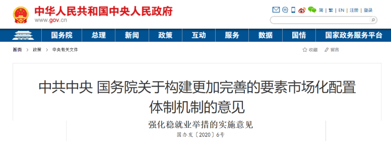 中共中央 国务院关于构建更加完善的要素市场化配置体制机制的意见