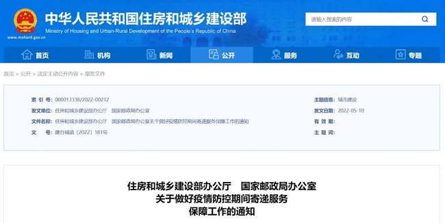 为坚决贯彻落实党中央、国务院统筹做好疫情防控和经济社会发展的决策部署,按照国务院物流保通保畅工作总体要求,5月10日,住房和城乡建设部办公厅、国家邮政局办公室印发关于做好疫情防控期间寄递服务保障工作的通知(建办城函〔2022〕181号),就全力保障末端寄递服务正常运转有关工作提出明确要求。