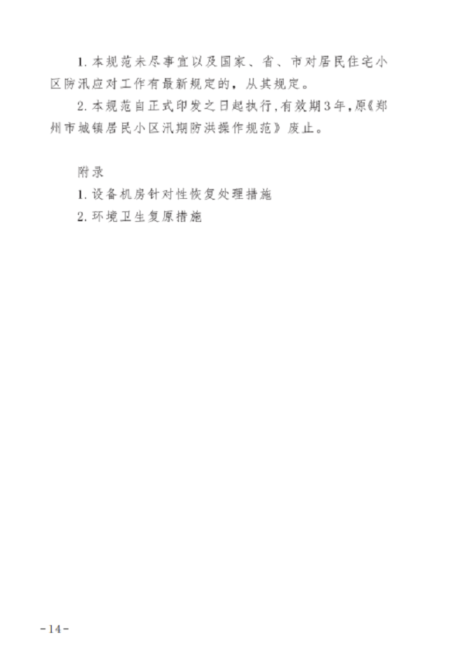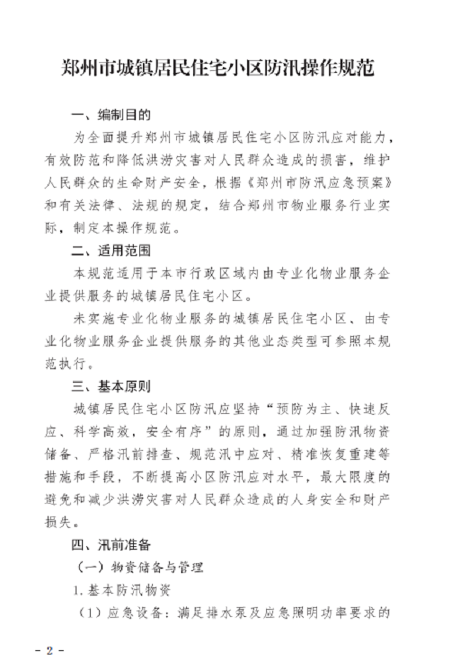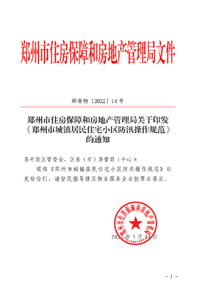 为全面提升郑州市城镇居民住宅小区防汛应对能力,有效防范和降低洪涝灾害对人民群众造成的损害,维护人民群众的生命财产安全,根据《郑州市防汛应急预案》和有关法律、法规的规定,结合郑州市物业服务行业实际,2022年5月11日,郑州市住房保障和房地产管理局印发《郑州市城镇居民住宅小区防汛操作规范》。