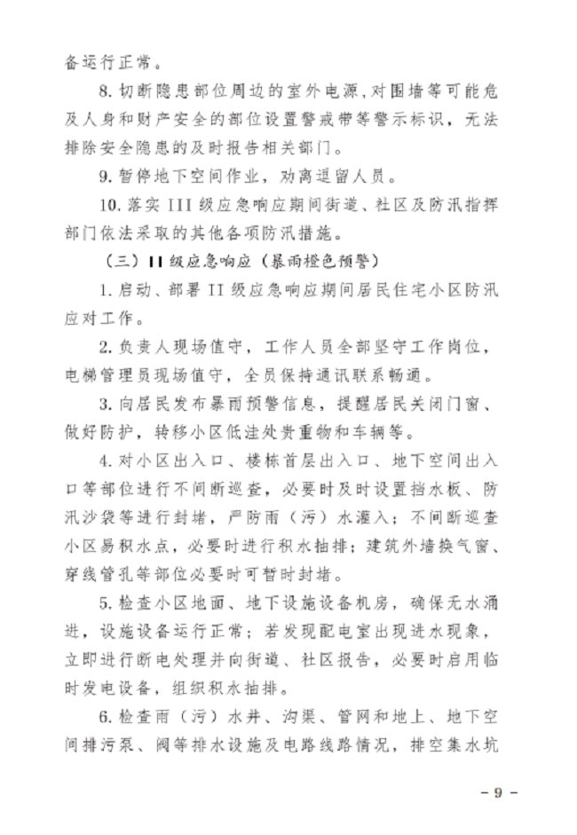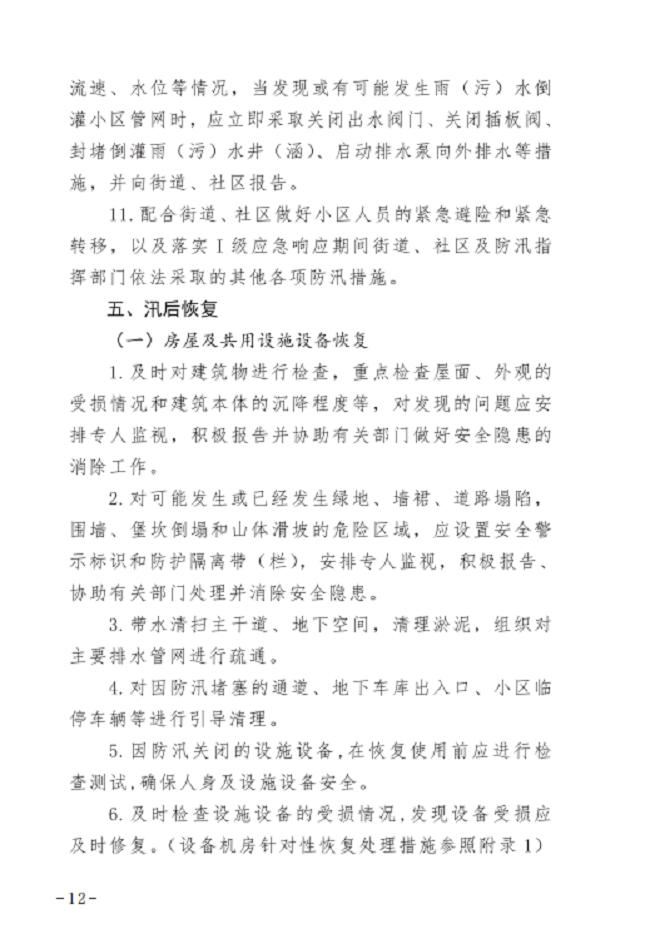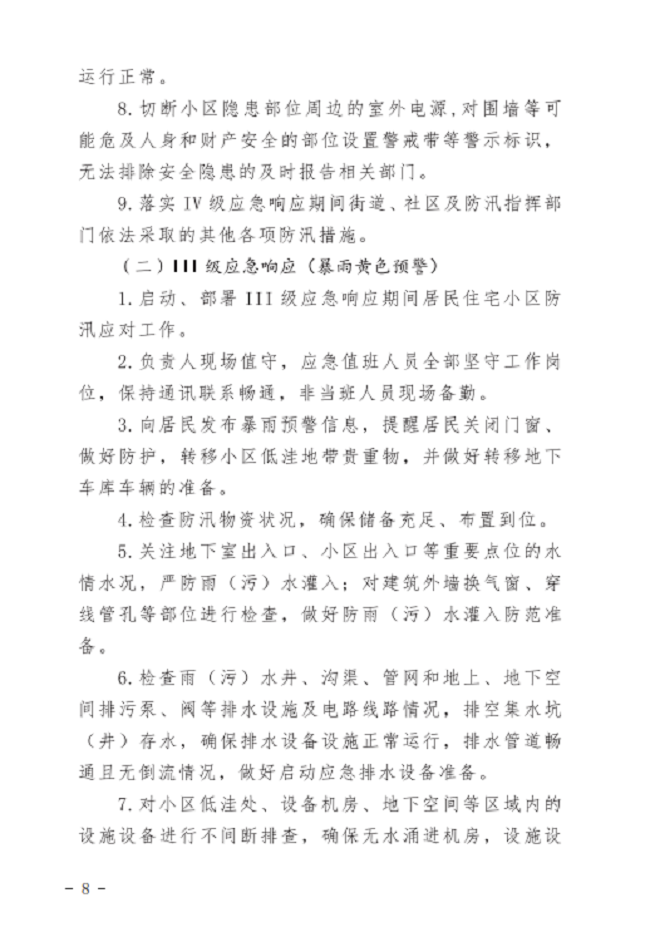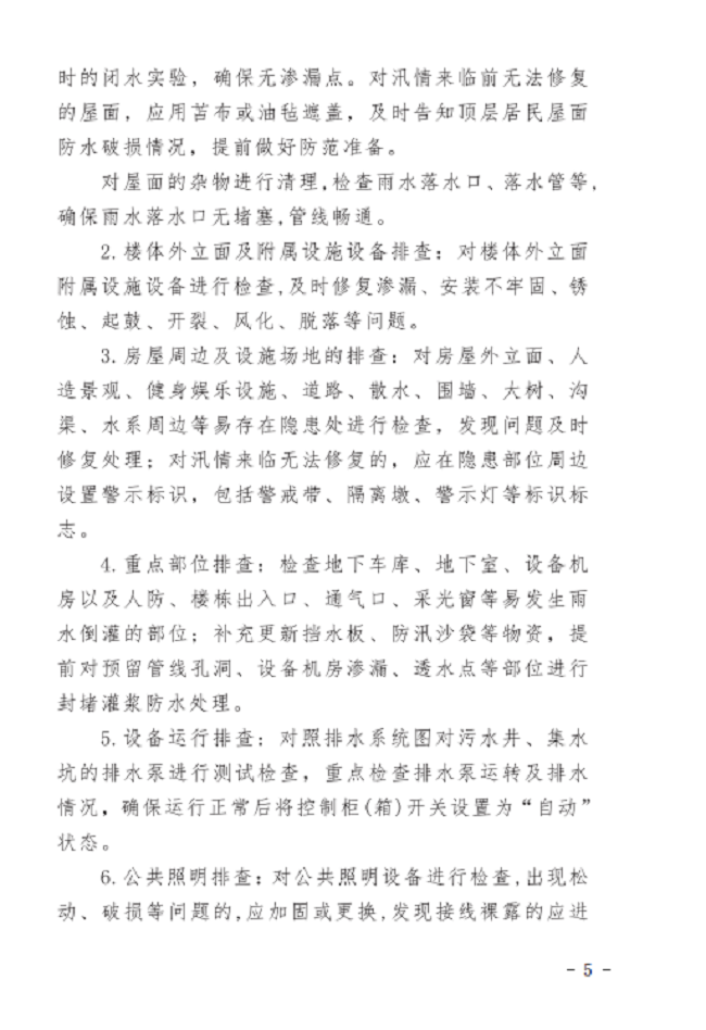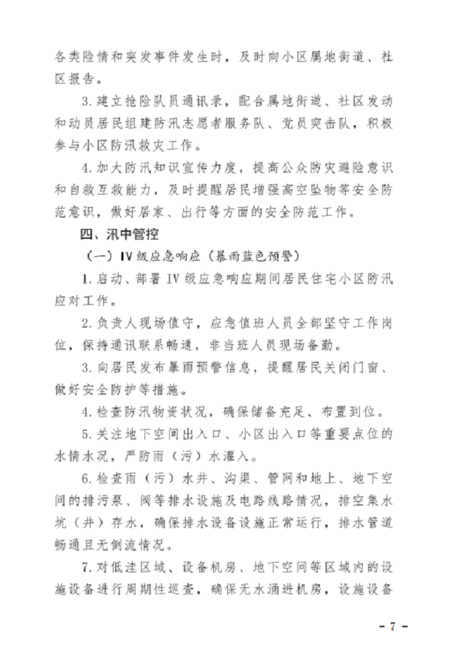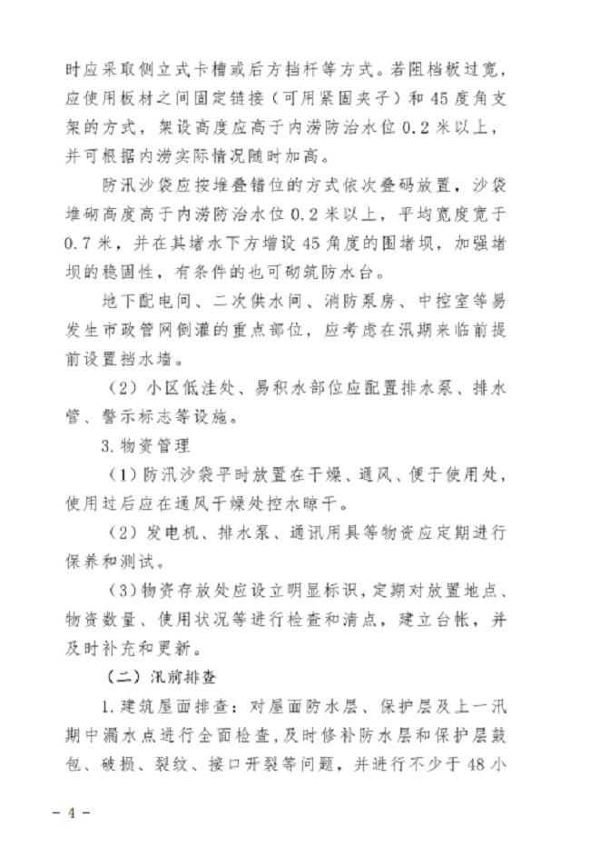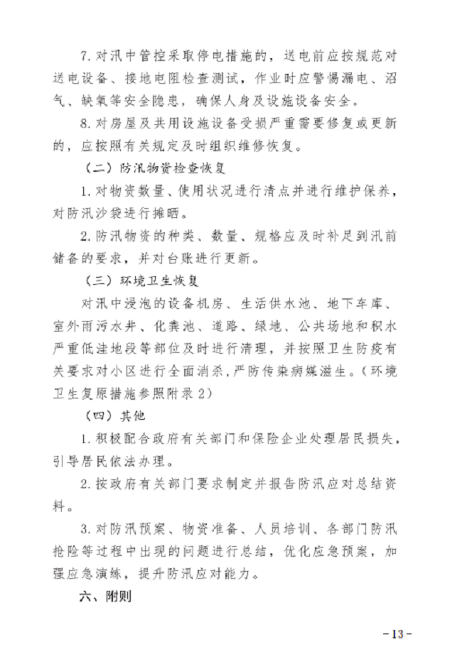 此操作规范要求城镇居民住宅小区防汛应坚持“预防为主、快速反应、科学高效,安全有序”的原则,通过加强防汛物资储备、严格汛前排查、规范汛中应对、精准恢复重建等措施和手段,不断提高小区防汛应对水平,最大限度的避免和减少洪涝灾害对人民群众造成的人身安全和财产损失。
