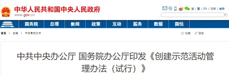 中共中央办公厅 国务院办公厅印发《创建示范活动管理办法(试行)》