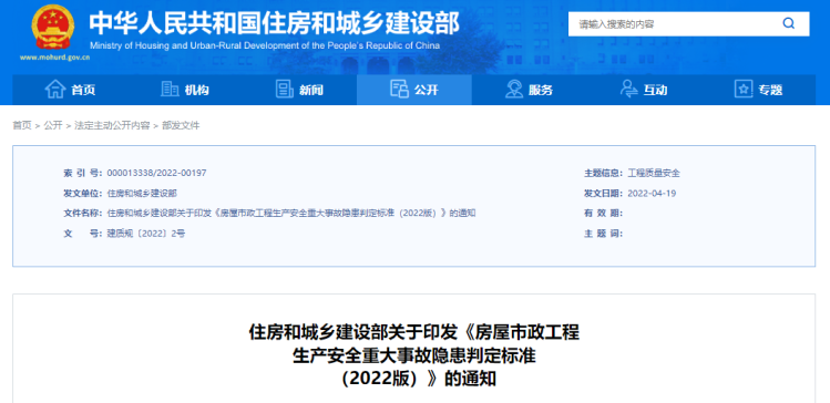 《房屋市政工程生产安全重大事故隐患判定标准(2022版)》的通知