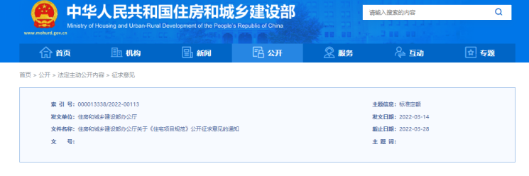 根据我部工程建设标准编制工作计划,《住宅项目规范》已起草完成,在前期多次征求意见基础上修改完善并经专家审查通过。现再次向社会公开征求意见。有关单位和公众可通过以下途径和方式提出反馈意见:
