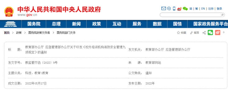 教育部办公厅 应急管理部办公厅关于印发《校外培训机构消防安全管理九项规定》的通知