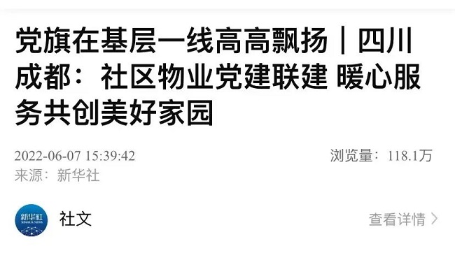 近日,新华社客户端以《党旗在基层一线高高飘扬|四川成都:社区物业党建联建 暖心服务共创美好家园》为题,报道了成都的社区物业党建联建。