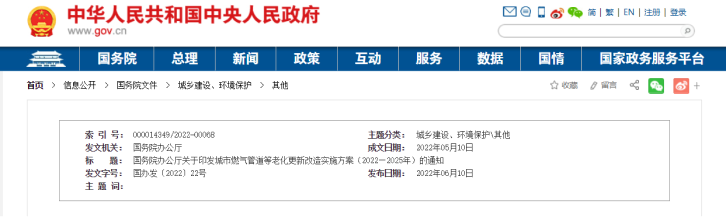 《城市燃气管道等老化更新改造实施方案(2022—2025年)》已经国务院同意,现印发给你们,请结合实际认真贯彻落实。