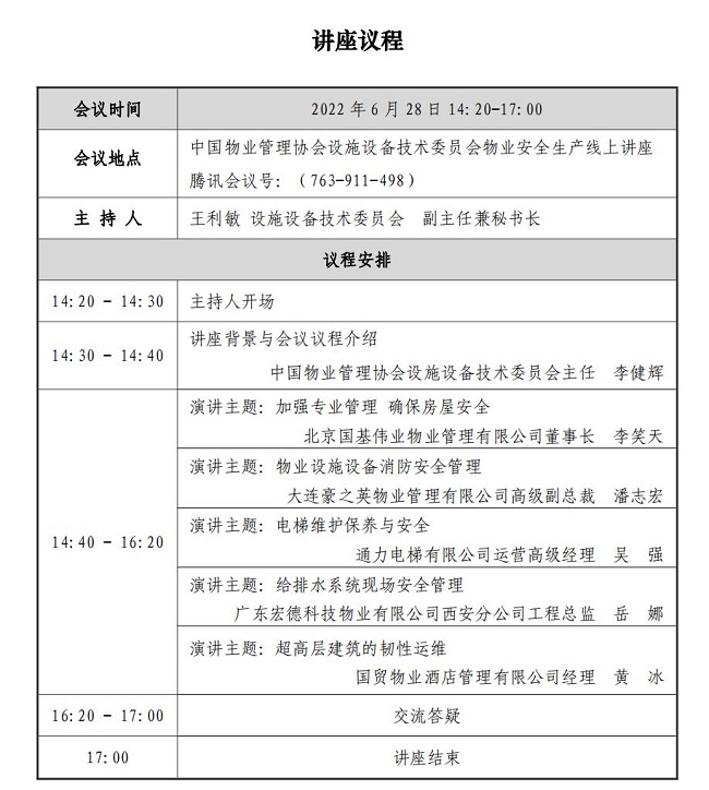 讲座围绕房屋安全管理、消防安全管理、电梯安全管理、给排水系统、超高层管理等物业管理安全生产内容,进行交流分享和专家答疑。具体议程详见附件。