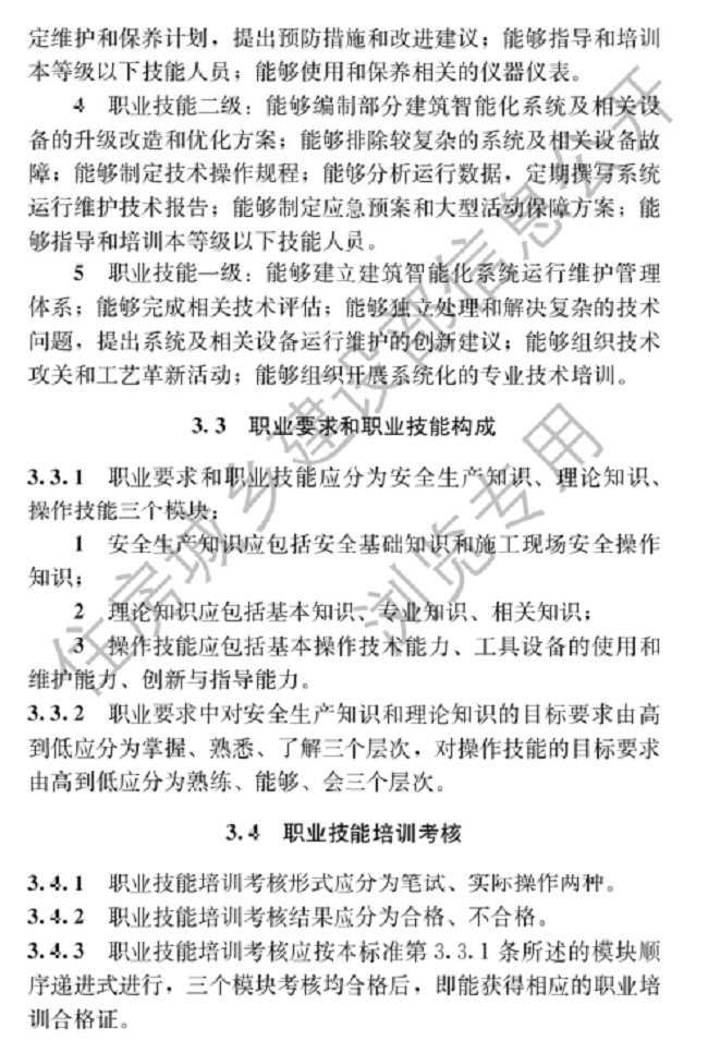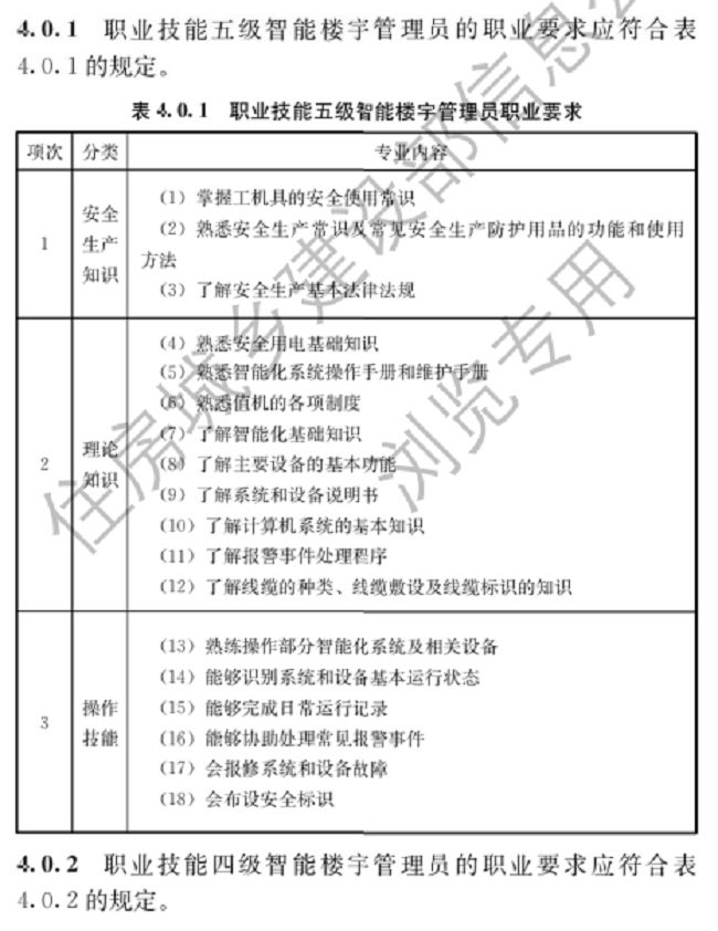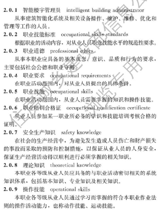 该标准旨为加强智能楼宇管理员从业人员的队伍建设,推进智能楼宇管理员职业培训制度的实施,规范智能楼宇管理员职业技能标准及培训考核。主要内容包括总则、术语、基本规定、职业要求、职业技能、培训考核。