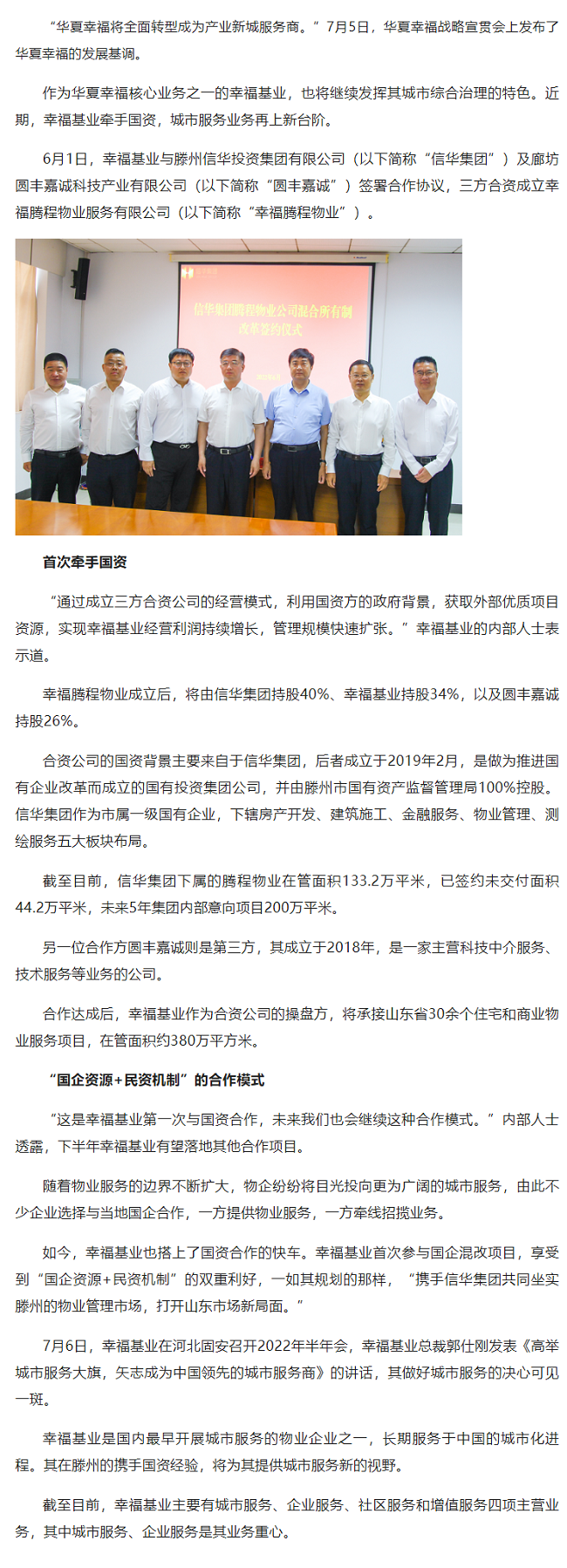 幸福基业:牵手国资,城市服务业务再上新台阶