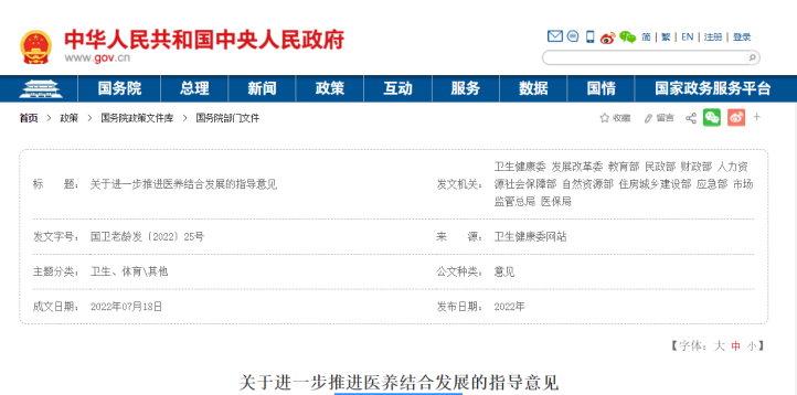 推进医养结合是优化老年健康和养老服务供给的重要举措,是积极应对人口老龄化、增强老年人获得感和满意度的重要途径。近年来,医养结合政策不断完善,取得积极进展,但在政策支持、服务能力、人才建设等方面仍存在一些难点堵点问题。各地各相关部门要坚持以习近平新时代中国特色社会主义思想为指导,认真贯彻落实党中央、国务院决策部署,进一步完善政策措施,着力破解难点堵点问题,促进医养结合发展,不断满足老年人健康和养老服务需求。经国务院同意,现提出以下意见: