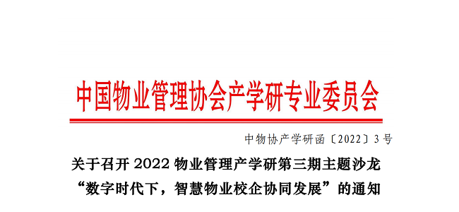 为深入探讨数字时代下智慧物业的发展现状与前景,凝聚校企协同助力智慧物业发展,经研究,定于7月28日以线上会议形式召开2022物业管理产学研第三期主题沙龙——“数字时代下,智慧物业校企协同发展”,具体安排通知如下: