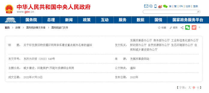为贯彻落实党中央、国务院决策部署和国家“十四五”规划《纲要》有关要求,深入实施《关于加快废旧物资循环利用体系建设的指导意见》(发改环资﹝2022﹞109号),根据有关工作安排,经各地自愿申报、省级部门推荐、省政府审核、国家复核,确定北京市等60个城市为废旧物资循环利用体系建设重点城市。现予公布,并就有关工作通知如下: