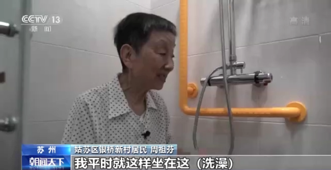 姑苏区银桥新村居民周祖芬:“你看看我们的凳子,我平时就这样坐在这(洗澡),起来就有扶手,很轻松。”