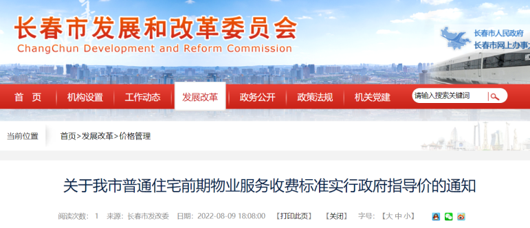 关于长春市普通住宅前期物业服务收费标准实行政府指导价的通知