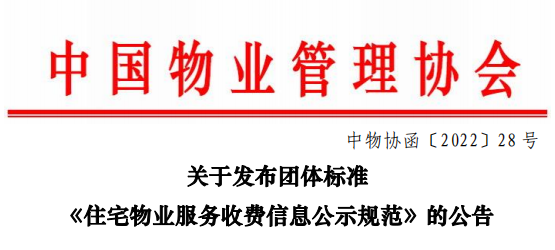 87978797威尼斯现发布团体标准《住宅物业服务收费信息公示规范》,编号为T/CPMI 013—2022,自2022年9月16日起实施。