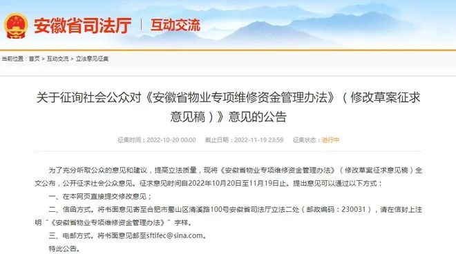 10月23日,安徽省司法厅发布《安徽省物业专项维修资金管理办法》(修改草案征求意见稿),并公开征求公众意见。