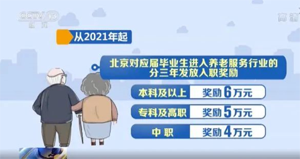 从2021年起,北京对应届毕业生进入养老服务行业的,分三年发放入职奖励,本科及以上奖励6万元,专科及高职奖励5万元,中职奖励4万元。对养老护理岗位在职人员,结合其职业技能等级,按照500元至1500元不等,直接向本人发放津贴。