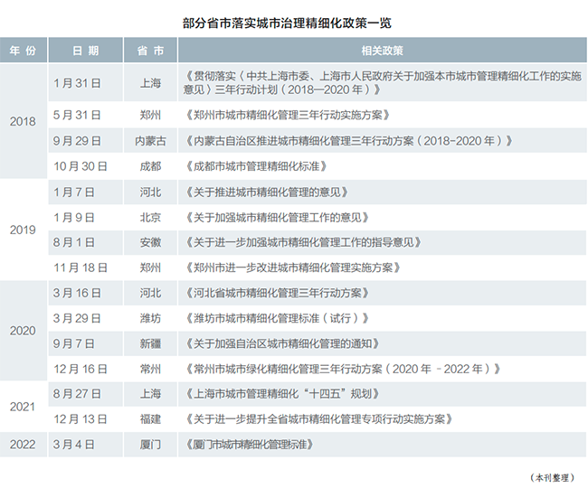 2017年3月,习近平总书记提出“城市管理应该像绣花一样精细”。2018、2019年政府工作报告随即提出新型城镇化要加强精细化服务;2020年政府工作报告进一步提出“大力提升县城公共设施和服务能力”。此间,“全面提升城市品质”也被写进了“十四五”规划中,要求加快转变城市发展方式,统筹城市规划建设管理,实施城市更新行动,推动城市空间结构优化和品质提升;坚持党建引领、重心下移、科技赋能,不断提升城市治理科学化精细化智能化水平,推进市域社会治理现代化。