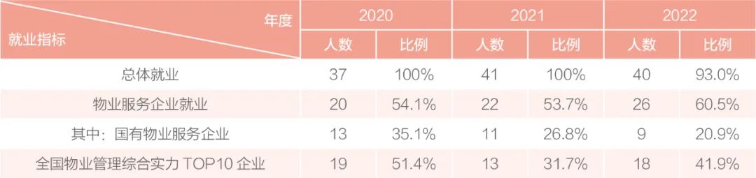 石家庄学院物业管理专业以市场需求为导向,以能力培养为抓手,依托雄厚的就业基地实力,政、协、企、校协同,教、赛、创、研四位一体,科学推进物业管理专业人才培养工作,切实提高毕业生就业竞争力。即使是在疫情阴霾笼罩的近三年里,毕业生就业质量仍实现逆风飞扬。特别是选择物业服务企业就业的学生占比逐年增长,显示出物业管理行业对毕业生的吸引力在稳步提升(表1)。